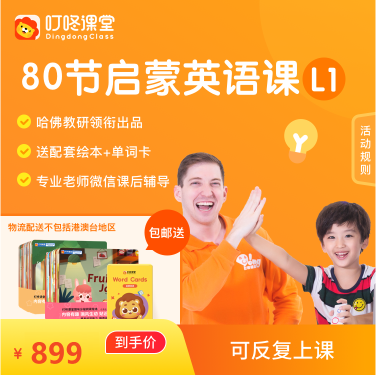 ①80课时原价1099元,下单立减200元,续费用户再减100元。送20本配套启蒙绘本+50张配套单词卡