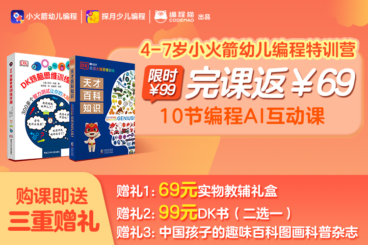 注:此课程仅限新用户购买,之前购买过9元小火箭幼儿编程启蒙课、9元探月少儿编程课的用户不能购买,老用户购买经工作人员核查后会自动退款并取消体验资格。(老用户即使兑换成功了也会退款处理哦)
