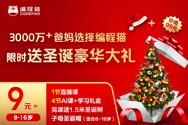 产品内含:1节直播课+4节AI课+学习礼盒+完课送1.5米圣诞树、子母圣诞帽