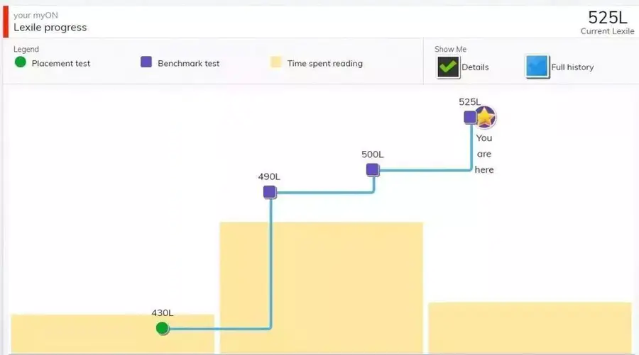 注册myON账号并完成第一次初始蓝思测试后,会有一个初始的蓝思值,结合接下来每两周的阶段性蓝思测试结果,会形成蓝思值的发展走向图。