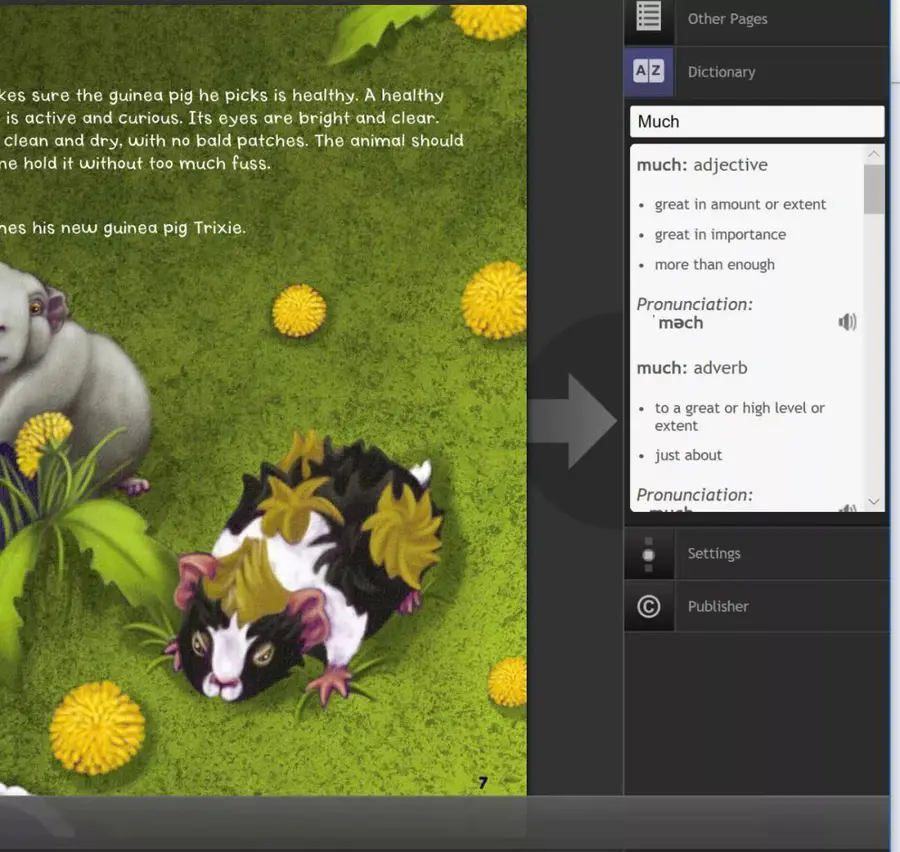 字典功能就是myON平台非常实用的阅读工具之一。平台提供了在线的英英词典。在阅读界面,碰到不认识的单词,鼠标单击单词,会在屏幕右边显示单词的英语解释。