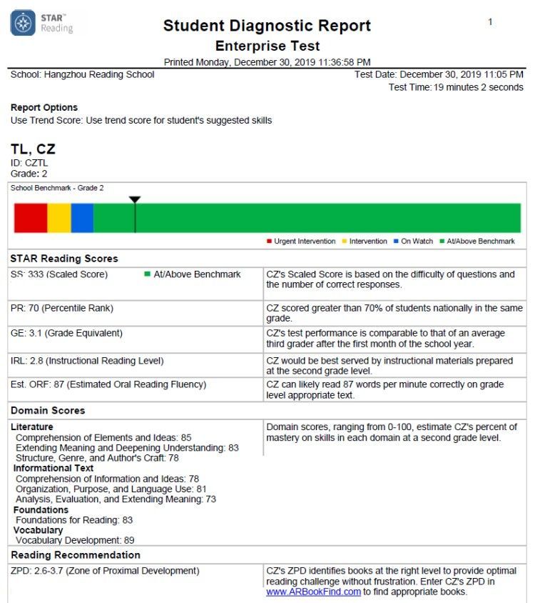 通过Star Reading 阅读测评,定位孩子英语阅读水平。获取详细的阅读测试报告和推荐阅读区间值ZPD