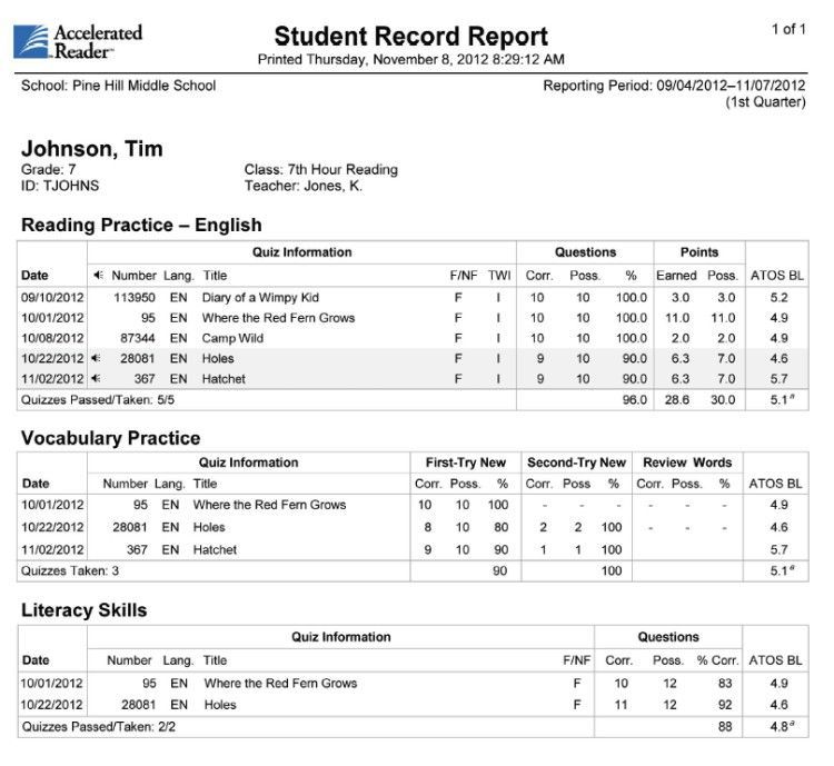学生记录报告:通过查看Student Record Report(学生记录报告),查看孩子的所有测试情况,包含书名,书的难度,书的分类,每一个测试的正确率以及阅读量。