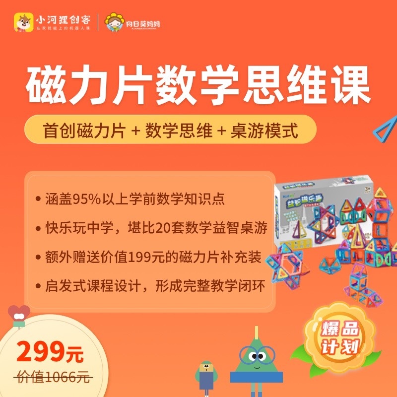 课程内含:小河狸创客40节思维课+配套价值398元的磁力片数学套餐:60片磁力片+15张游戏卡+52个组件,一共127件