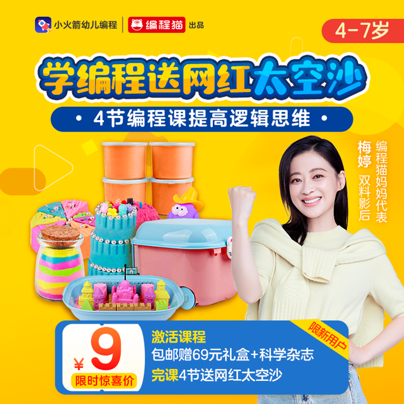 课程内含:4节编程课+激活赠69元学习礼盒+科普杂志一本+完课4节送网红太空沙(数量如下)