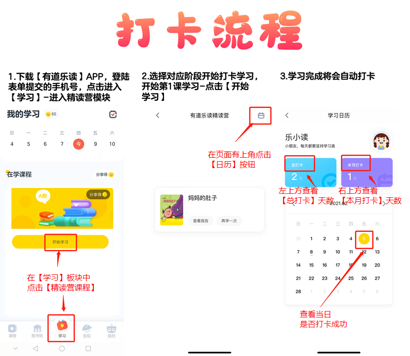 ④下载有道乐读App,使用购课预留的手机号注册登录,点击【课程】—进入【网易有道少儿中文分级全年阅读课】-【购买的对应阶段】—选择【阅读环节】—点击【立即阅读】—阅读完成后点击【开始闯关】进行测试—完成跟读环节—完成学习后,系统将自动打卡