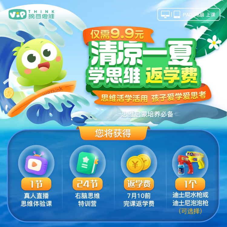 7月10日前完成1节豌豆思维直播课程学习,向日葵官方将在7月25日前统一返5元学费到您的向日葵账户中,奖励每一位要在这个夏天杨帆起航的豌豆宝宝