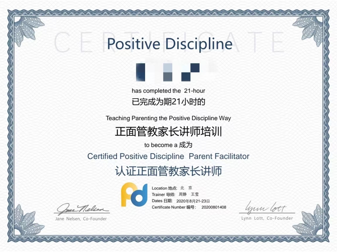 ● 由正面管教(两位创始人)签发的“注册正面管教家长讲师(CPDPE)”资格证书;
