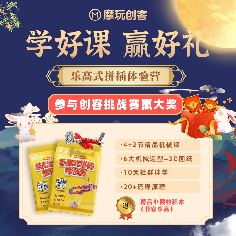 课程内含:4+2 节精品课、49颗乐高式积木教具、10天精英老师伴学、黑科技3D图纸6张(电子版),完课获得创客挑战赛机会