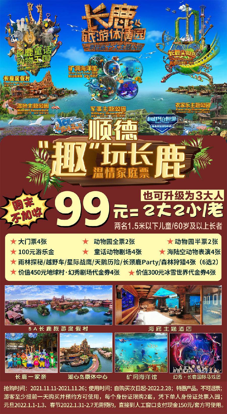【费用包含】2大2小或3大家庭票:含大门票4张+童话动物王国全票2张+童话动物王国半票2张+100游乐金+童话动物剧场4张+海陆空动物表演4张+雨林探秘/越野车/星际战鹰/天鹅历险/长颈鹿party/森林狩猎 4张(6选2)+价值150元/张地球村成人代金券2张+价值75元/张地球村儿童/长者代金券2张+价值75元/张冰雪世界代金券4张
