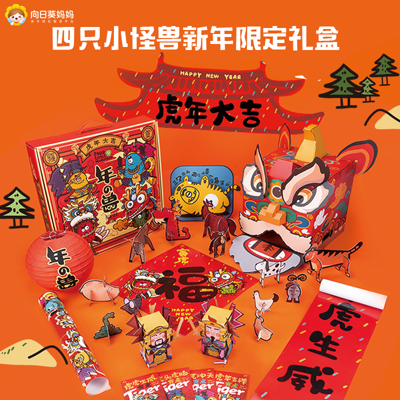 ①年兽礼盒:醒狮、门神、生肖时钟、虎灯、太空泥、春联、福牌、年历、红包、萌虎贴画