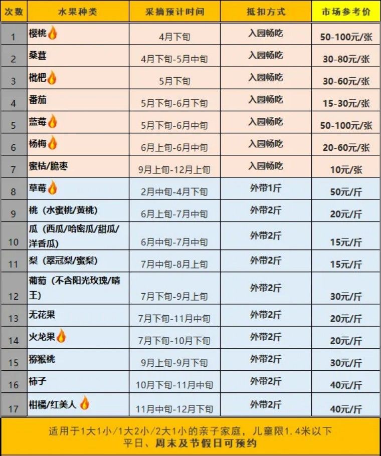 ▪ 凭水果护照入园畅吃(7次畅吃券):樱桃、桑葚、番茄、蜜桔/脆枣、蓝莓、杨梅、枇杷
