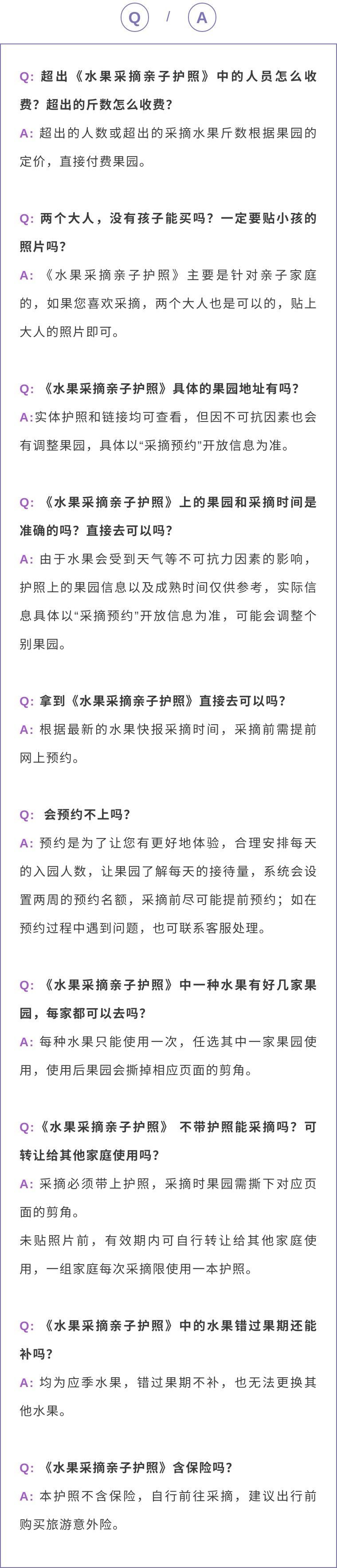 【使用人群】本护照为家庭采摘护照,适用于1大1小/1大2小/2大1小的亲子家庭,儿童限1.4米以下。单加儿童/成人现场收费标准为0-100元/人不等,以各园区现场收费为准。一个家庭每个果园每次采摘限使用1本护照,谢绝一次带2本同时使用,果园有权拒绝入园。