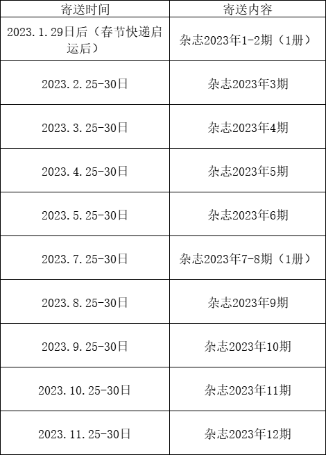 2023年1月-2023年11月,每月25日-30日前后发出(其中1-2,7-8为合刊)