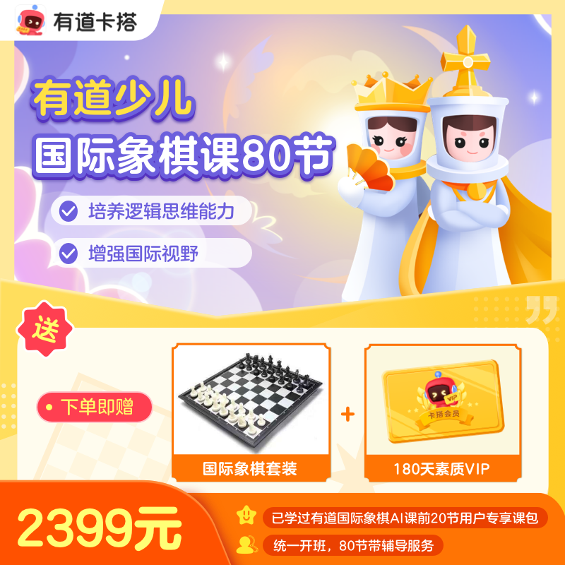 【活动信息】原价2999元,直播间特惠价2399元,赠送国际象棋实物礼盒(赠品随机发货)+对弈平台(长期有效)+180天素质会员(随主权益一同开通)