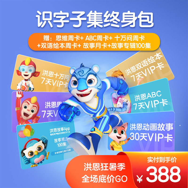 活动时间内购买【388元洪恩识字包】赠思维周卡+ ABC周卡+十万问周卡+双语绘本周卡+故事月卡+故事专辑100集