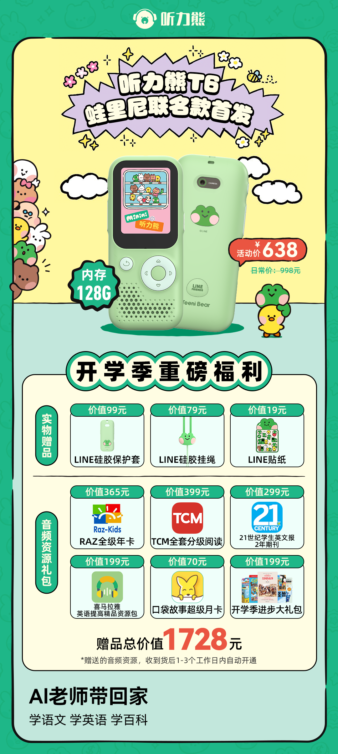 产品名称:听力AI智能听力机T6联名款蛙里尼(绿色128G)