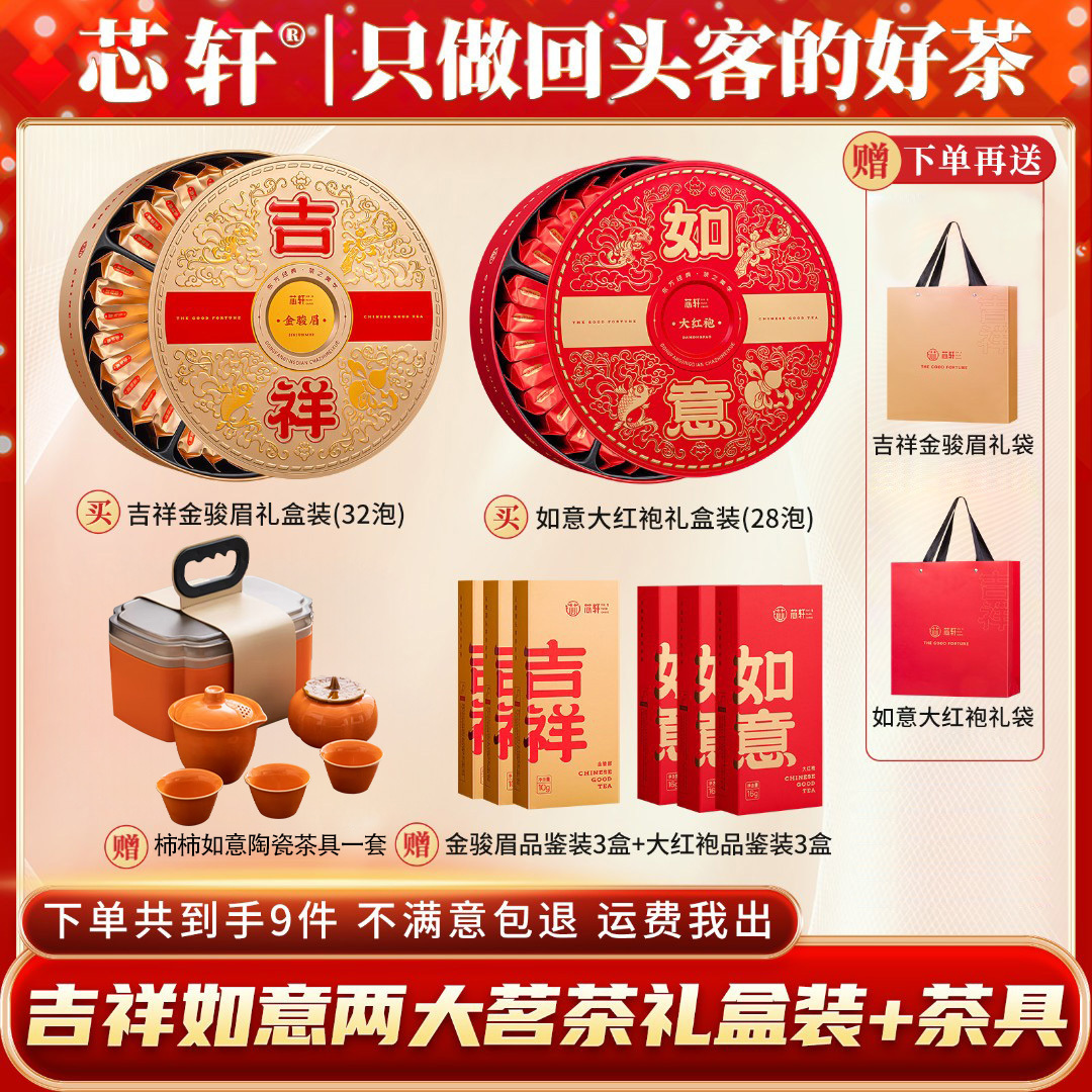 产品规格:主品:吉祥金骏眉160g、如意大红袍224g 赠品:柿柿如意陶瓷茶具一套,金骏眉品鉴装3盒+大红袍品鉴装3盒