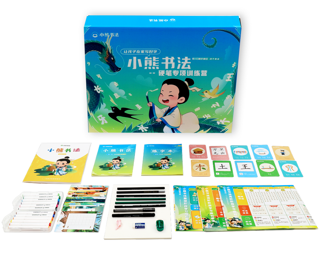 【实物清单】配套随材(2B铅笔、小熊素描纸、中性笔、握笔器、转笔刀、橡皮、透明磨砂文具铅笔收纳盒、12色水性马克笔、古诗作品纸(七言)、小熊书法教材、基础系统课专用练习本、书法课综合练习本、小熊书法基础图谱、小熊书法进阶图谱、小熊书法高阶图谱、趣味汉字)