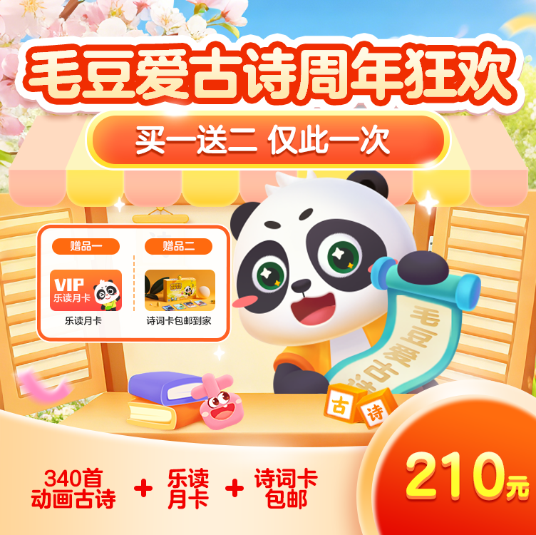 2、赠毛豆爱阅读月卡(爱古诗激活后的24小时内开通,“毛豆乐读”APP看课)