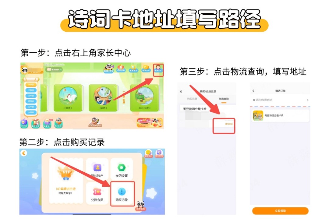 【地址填写】下载并登录【毛豆爱古诗】app - 点击右上角【家长中心】- 点击【购买记录】- 点击【物流查询】- 点击【填写地址】