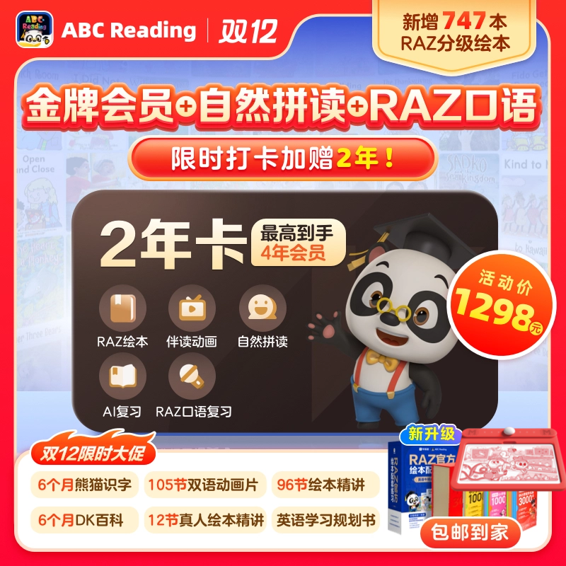 【双12享10重好礼,打卡最高再赠2年!】【畅学套餐】ABCReading金牌会员+自然拼读+RAZ口语会员联合【2年卡】:上新700+RAZ绘本+AI复习功能,解锁2000+原版绘本,畅享850节伴读动画盛宴,闭环自拼404节高效学习,让孩子的英语学习之旅更加精彩!