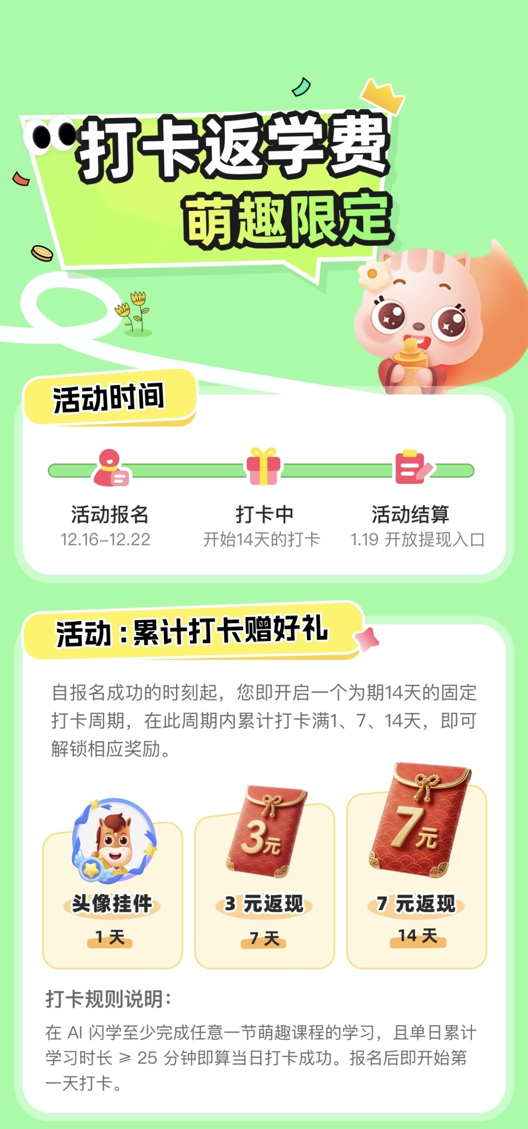 2、在 AI 闪学完成任意萌趣课,单日学够25分钟 = 打卡成功✅