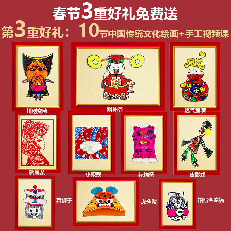 【产品内含】年习俗10米绘画长卷+赠剪纸课14节+欢乐中国年课程20节+十二生肖粘土课程12节+新增价值39.9马克笔绘画课20节