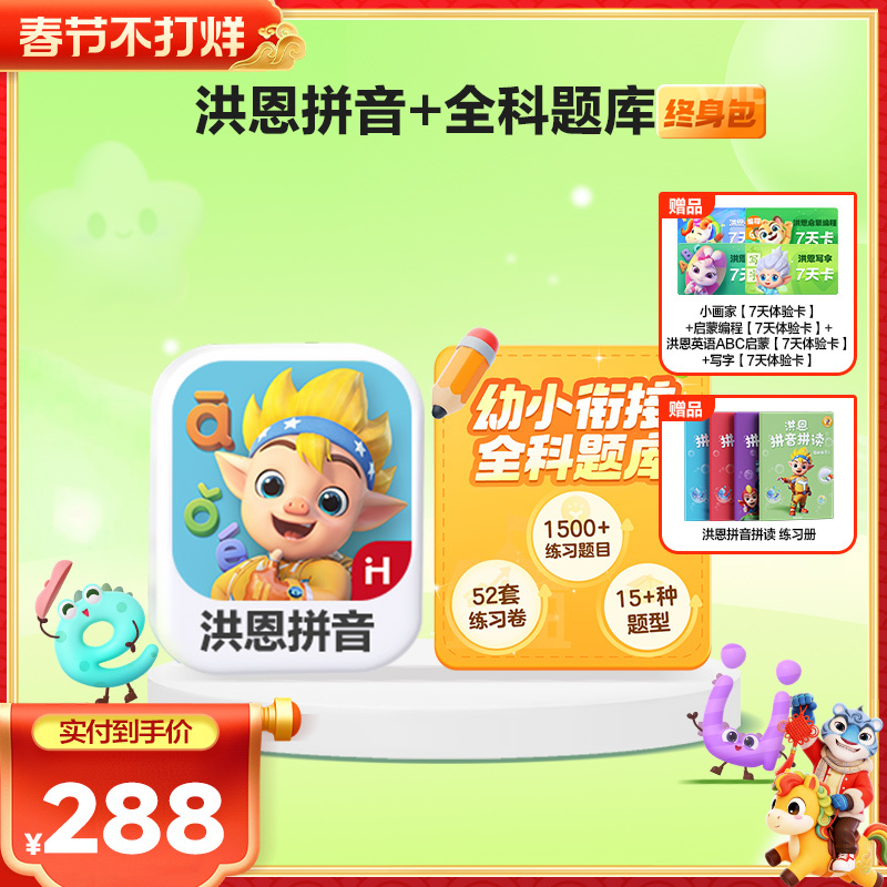 【活动时间】2月6日-28日24点,赠:小画家周卡+启蒙编程周卡+洪恩英语ABC启蒙周卡+写字周卡+价值30元 洪恩拼音练习册4本
