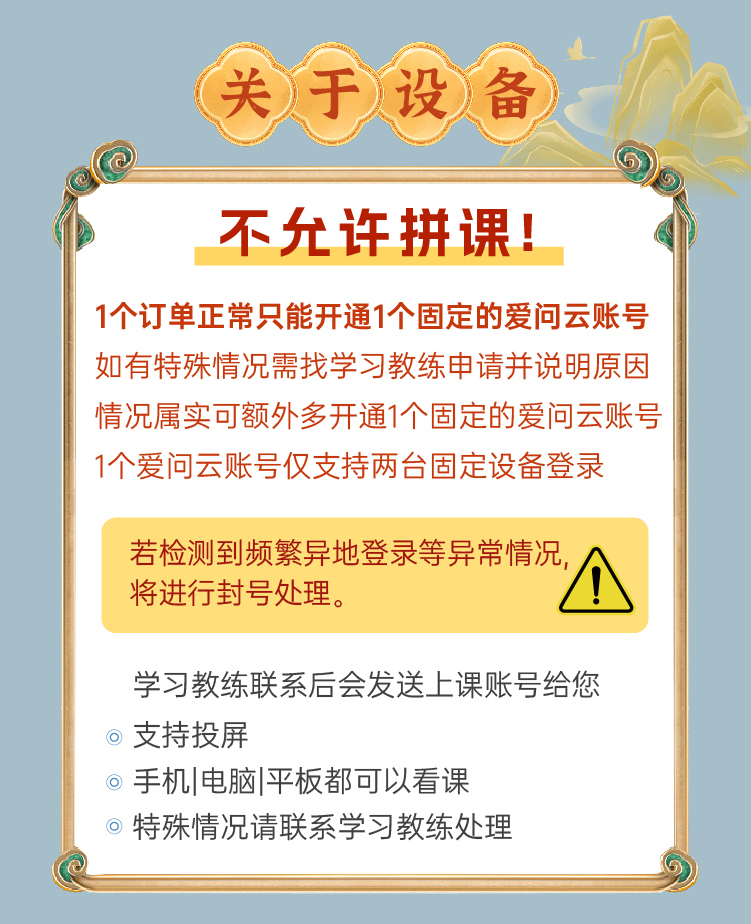 【设备要求】支持平板电脑/手机/电脑上课,其他设备需可以下载爱问云方可上课。1个爱问云账号仅支持两台固定设备登录。