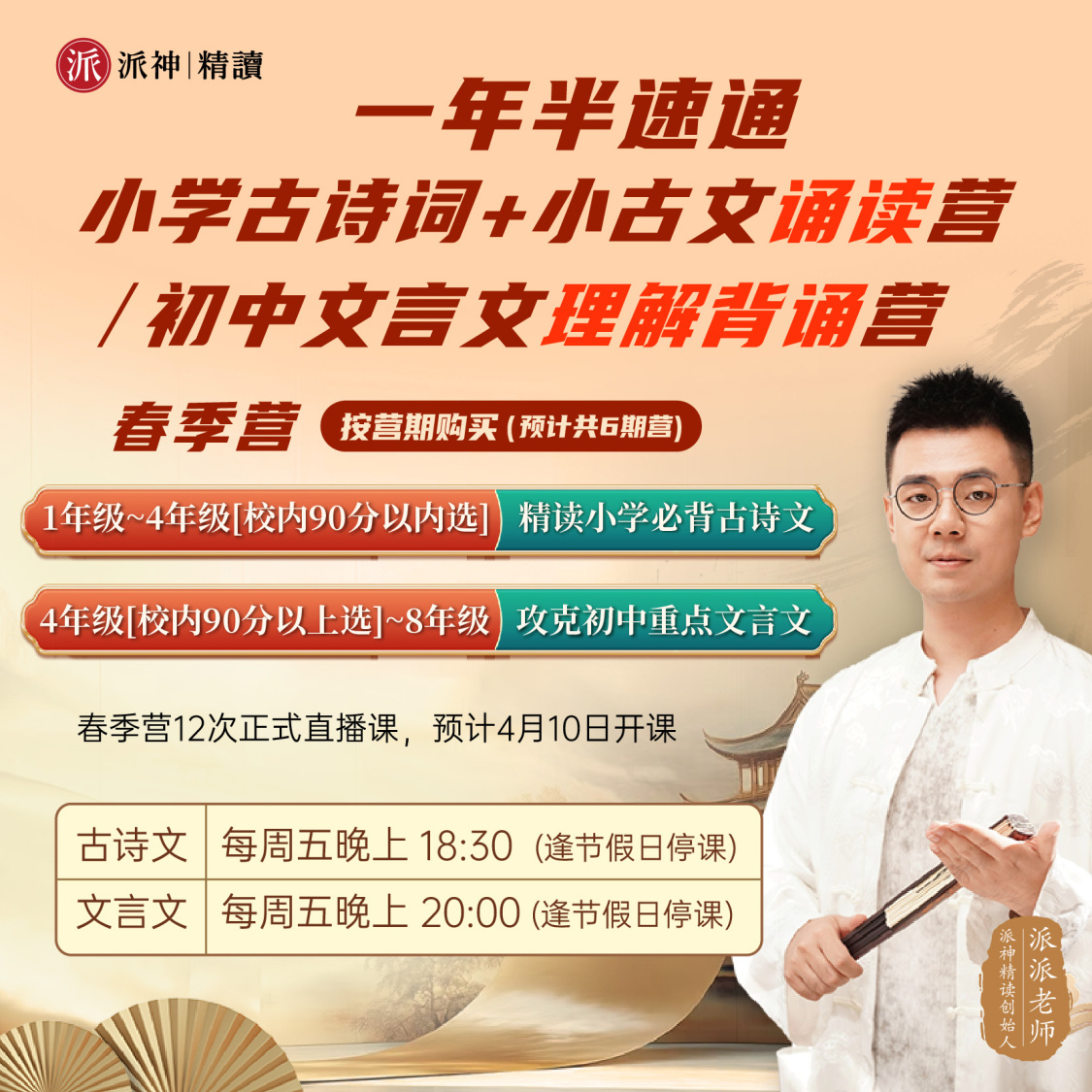春季营:春季营12次直播课。预计4月10日开课,每周五晚上18:30上课,一次课时长45分钟古诗词+10~15分钟小古文。带着孩子们精读小学6年里必背的古诗词和校内外小古文,重点解决孩子“背诗靠硬背、考试赏析题不会答”的问题,提前抢跑小学古诗文。赠送本期营对应篇目的小学必背古诗词视频课。