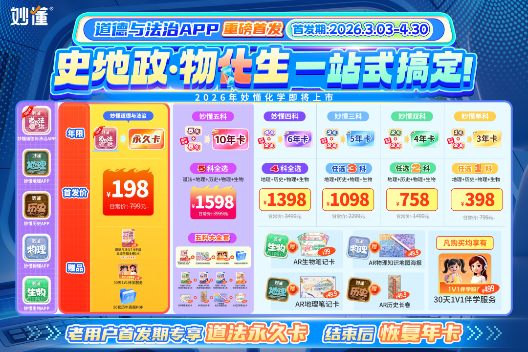 【版本说明】妙懂历史APP需要更新到5.5.1以上版本,妙懂地理APP需要更新到8.5以上版本才能正常使用新功能,妙懂物理APP目前是2.0版本,妙懂生物目前是1.0.0版本,妙懂道德与法治APP目前是1.1.1版本