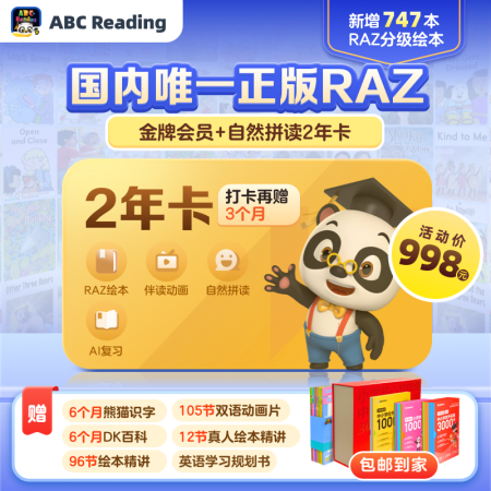 【全新升级,双11享8重好礼!】【启蒙套餐】ABCReading金牌会员+自然拼读联合【2年卡】:上新700+RAZ绘本+AI复习功能,解锁2000+原版绘本,畅享850节伴读动画盛宴,闭环自拼404节高效学习,让孩子的英语学习之旅更加精彩!